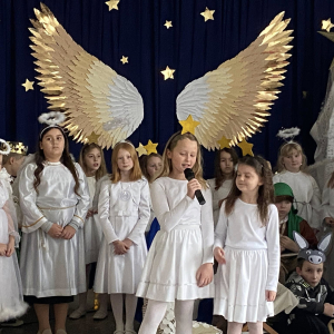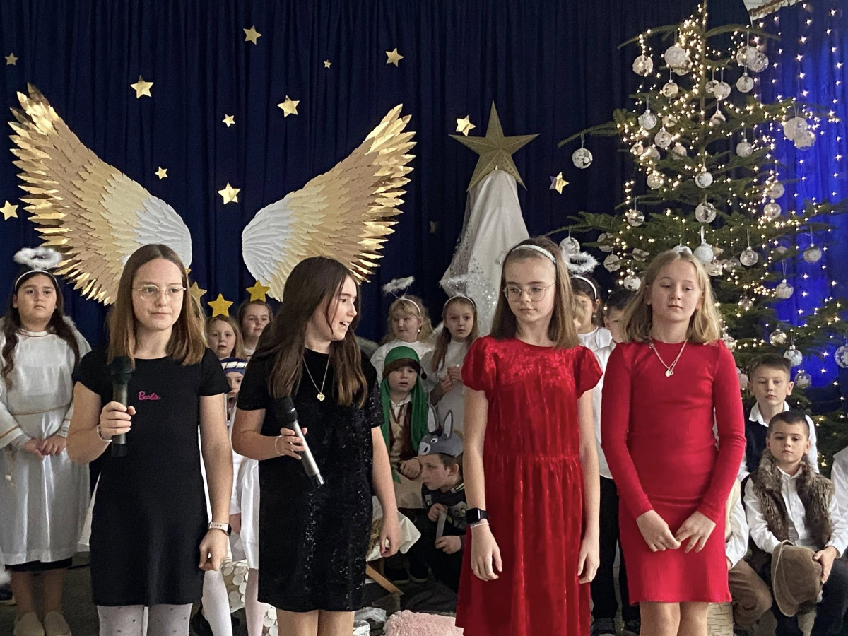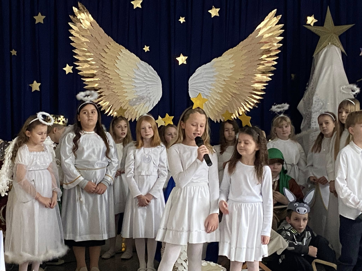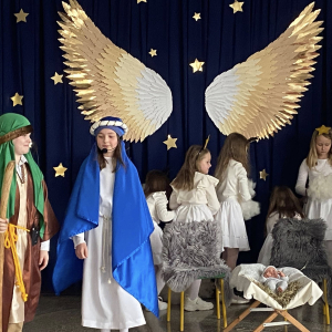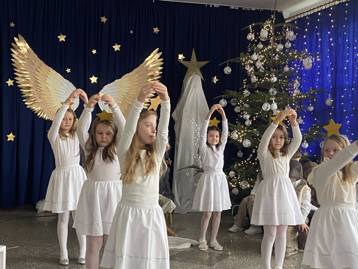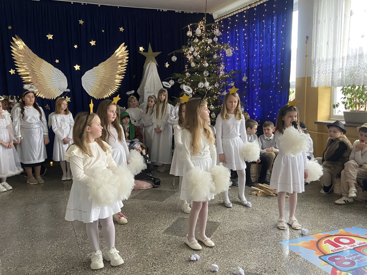Następnie na scenie obejrzeliśmy tańce dziewczynek wcielających się w role złotych gwiazdek i nocki. W zwiewnych kostiumach, przy nastrojowej muzyce, tancerki wykonały choreografię symbolizującą światło prowadzące pasterzy i mędrców do stajenki. Nie zabrakło Maryi, Józefa, aniołów, pasterzy, osiołka, owieczki oraz mędrców ze Wschodu i dzieci, którzy przypomnieli nam, że Boże Narodzenie dzieje się w sercu każdego człowieka. Młodzi aktorzy wykazali się ogromnym zaangażowaniem i talentem. Oprawa muzyczna, nastrojowe kolędy i pastorałki zachęcały całą społeczność szkolną do wspólnego śpiewu.