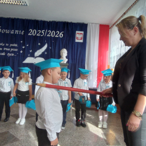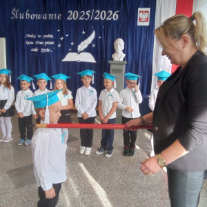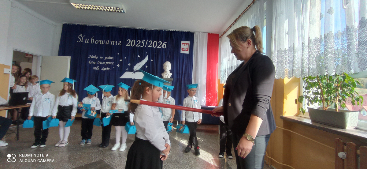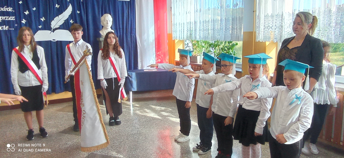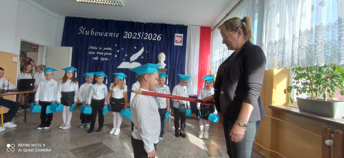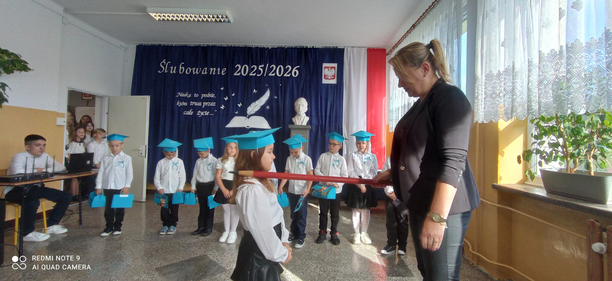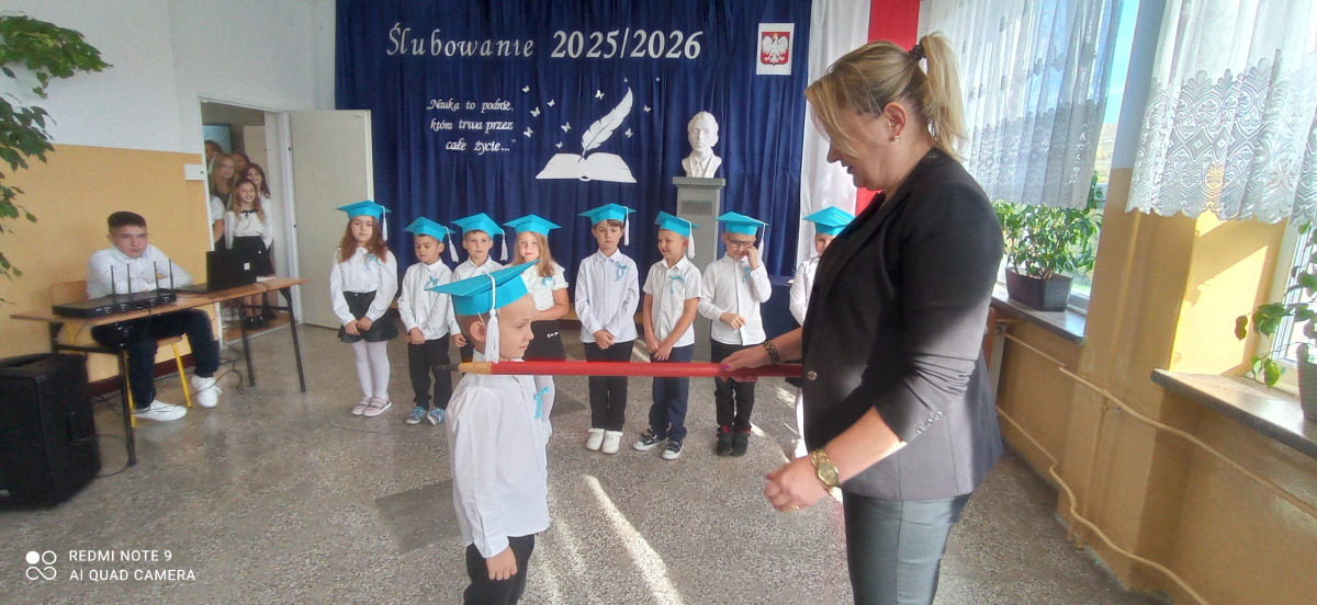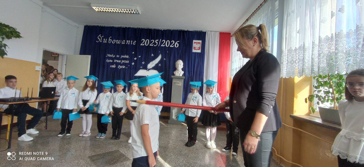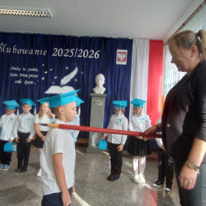 Najważniejszym momentem uroczystości był akt ślubowania oraz symboliczne pasowanie ołówkiem, którego dokonała pani dyrektor. Od tej chwili nasi pierwszoklasiści stali się pełnoprawnymi członkami społeczności szkolnej.