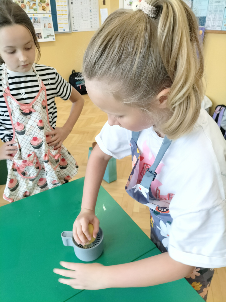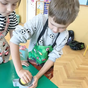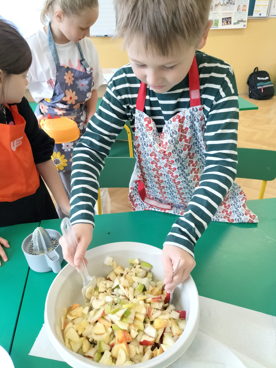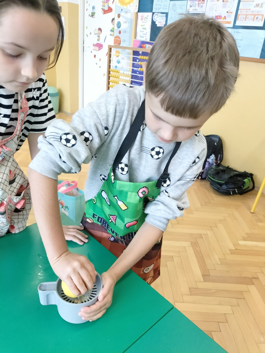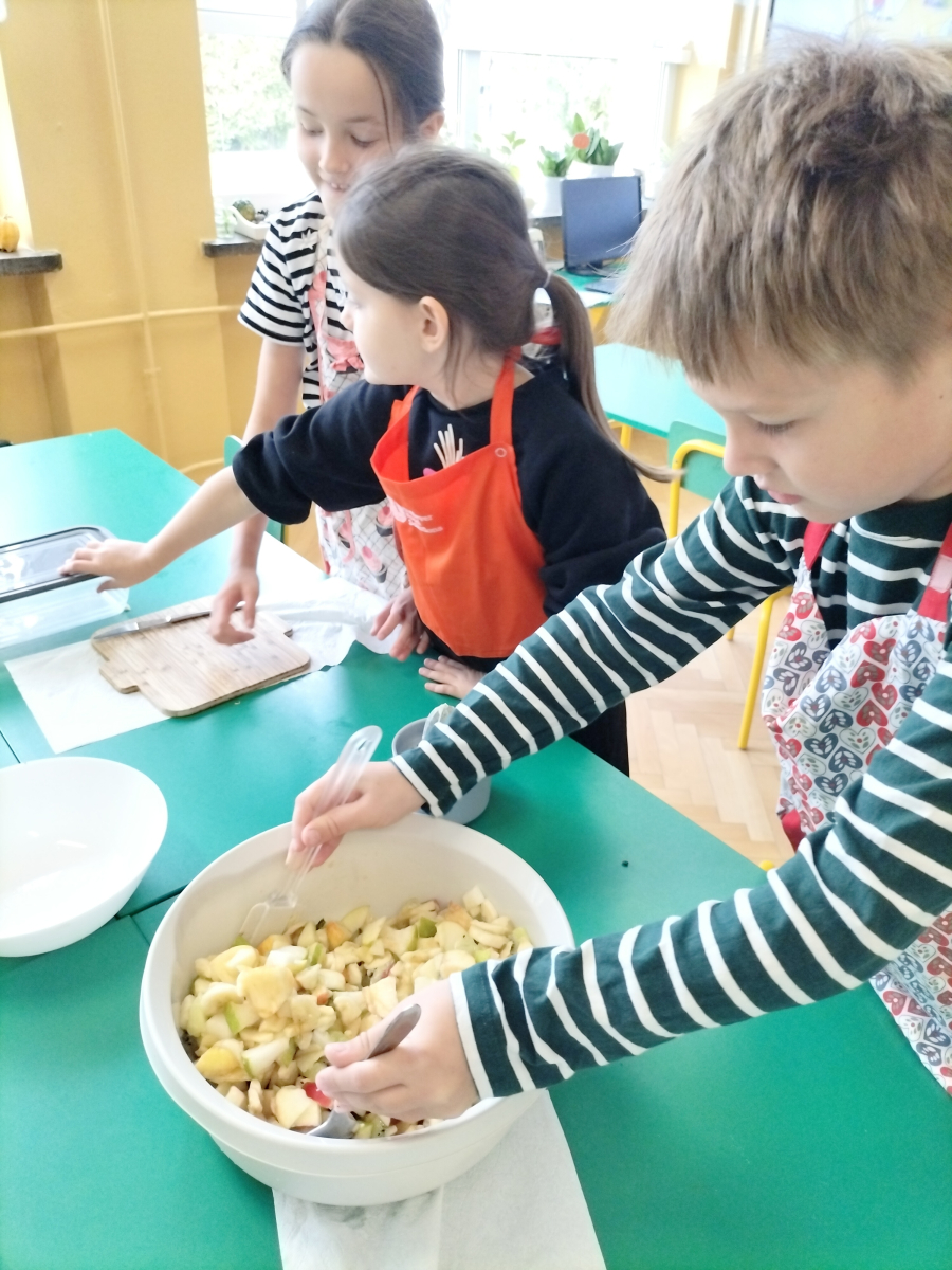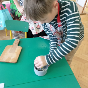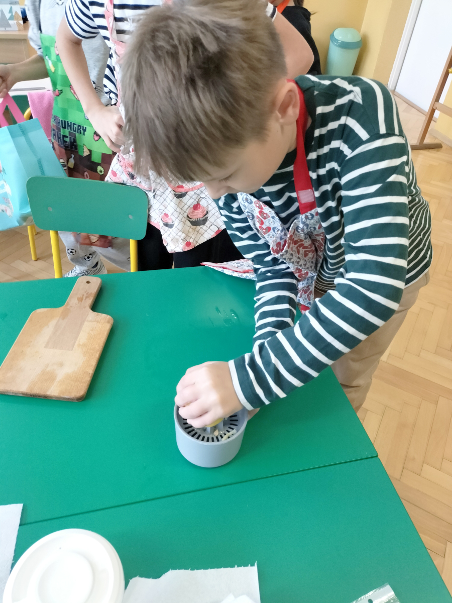 Uczniowie, pod opieką wychowawcy pani Magdaleny, z zapałem realizowali kolejne etapy przepisu . Pracując w grupach, wymieniając się rolami, uczyli się zarazem odpowiedzialności za powierzony sprzęt i współpracy.