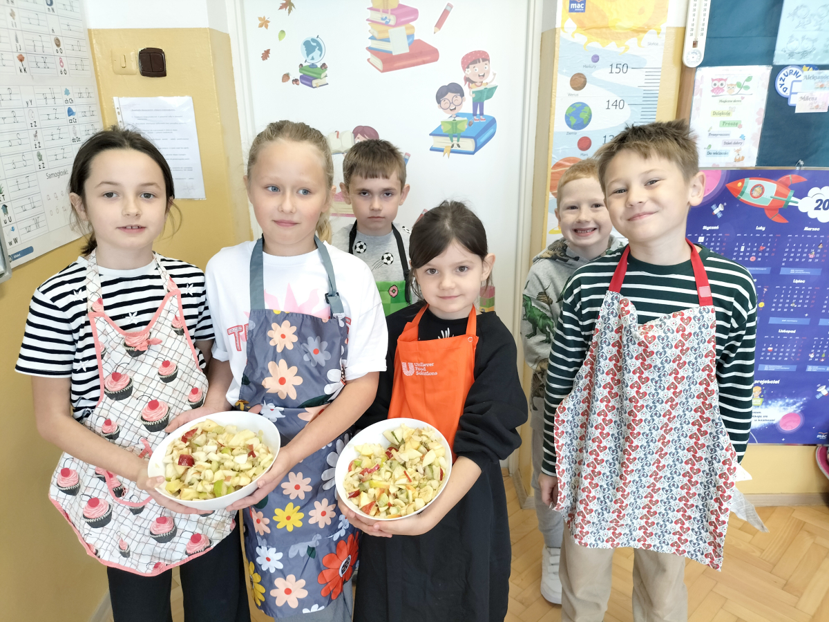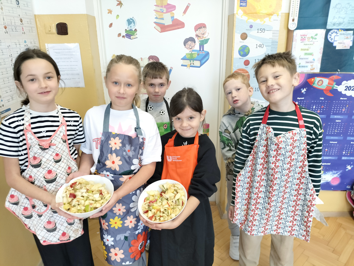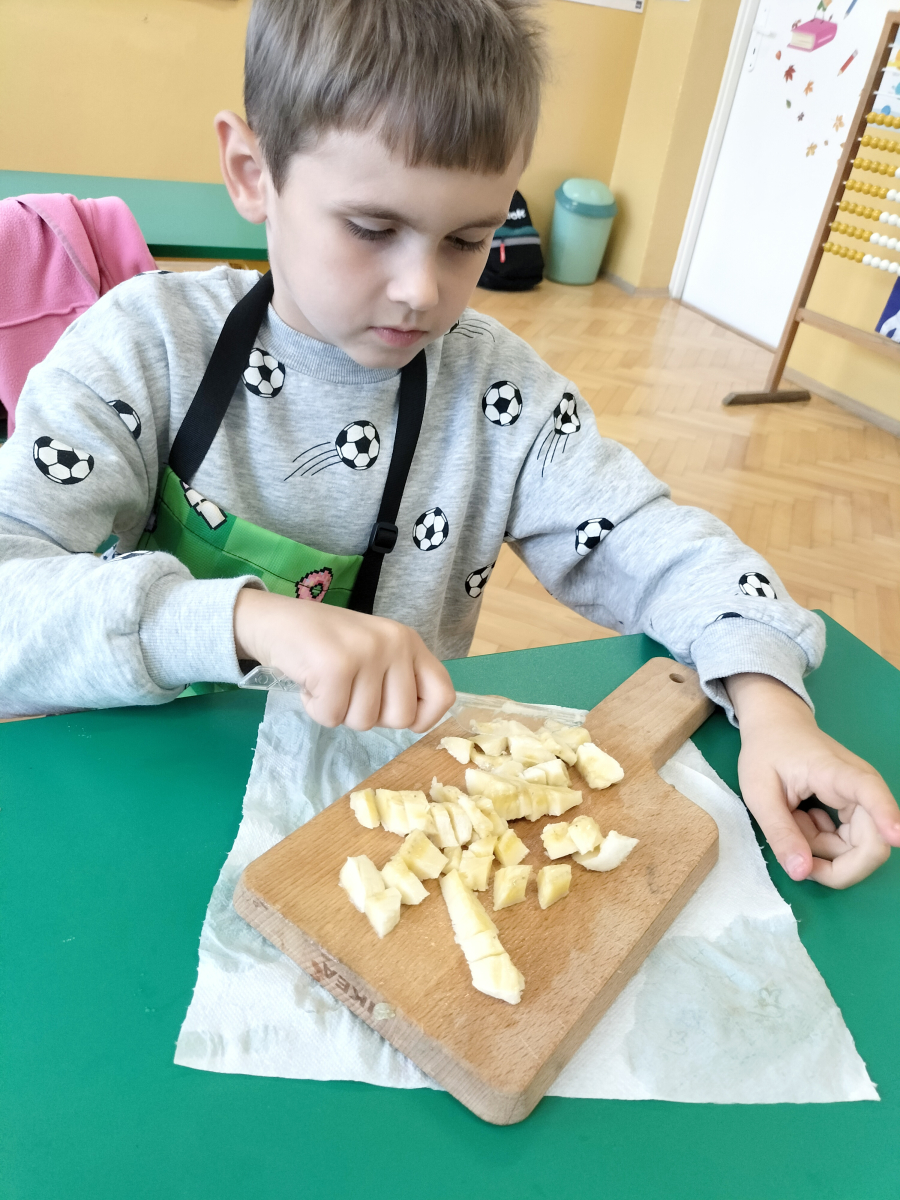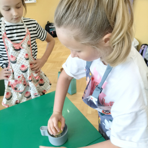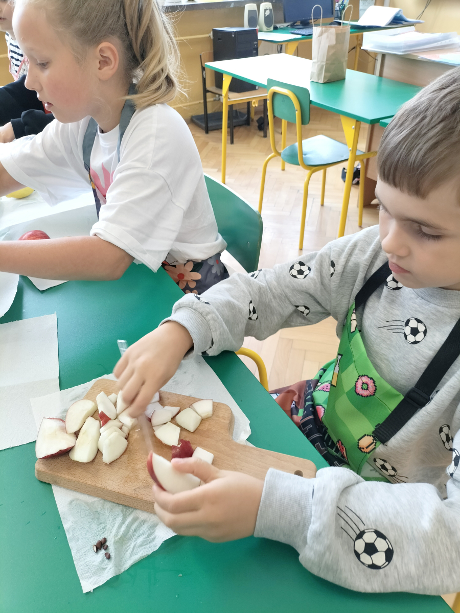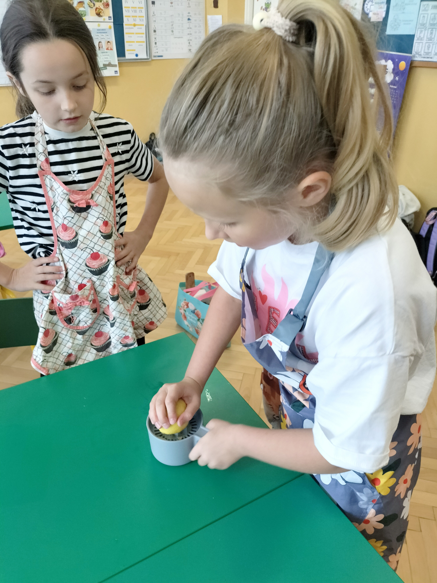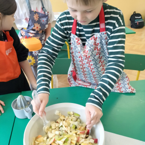 Uczniowie, pod opieką wychowawcy pani Magdaleny, z zapałem realizowali kolejne etapy przepisu . Pracując w grupach, wymieniając się rolami, uczyli się zarazem odpowiedzialności za powierzony sprzęt i współpracy.